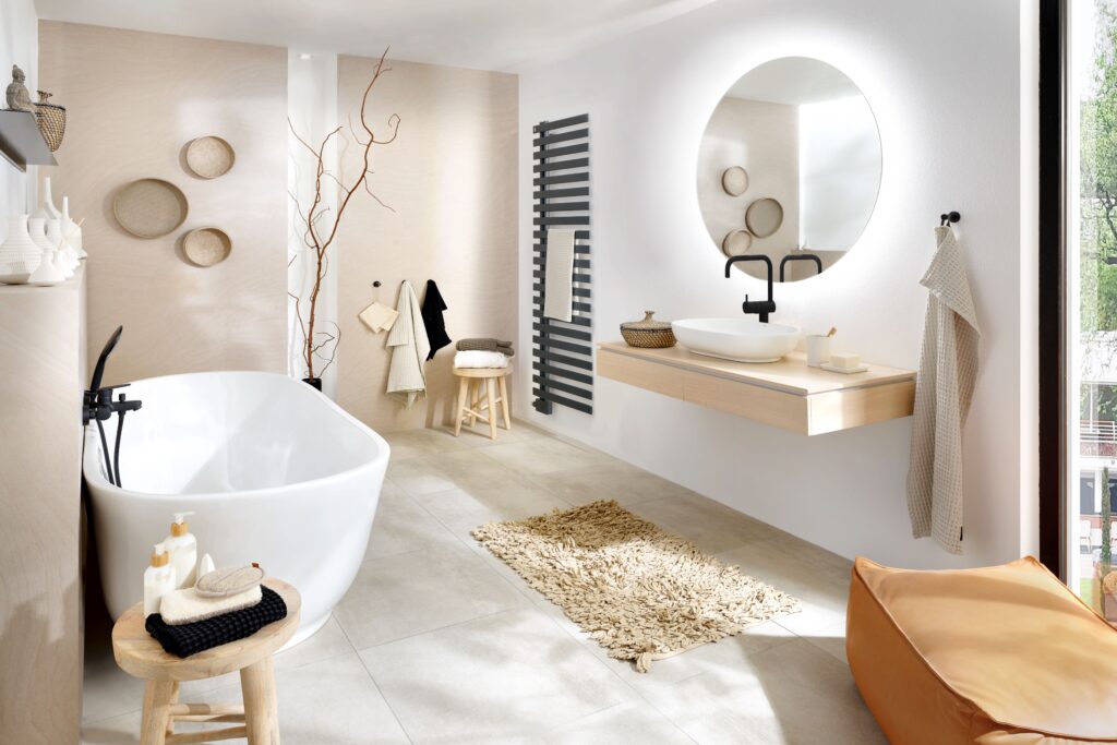 Entspannung garantiert: Japandi ist ein Interior Design-Stil inspiriert von zwei unterschiedlichen Elementen, der skandinavische Einrichtung mit japanischem Minimalismus – hier wunderschön als Badezimmerensemble in Szene gesetzt.