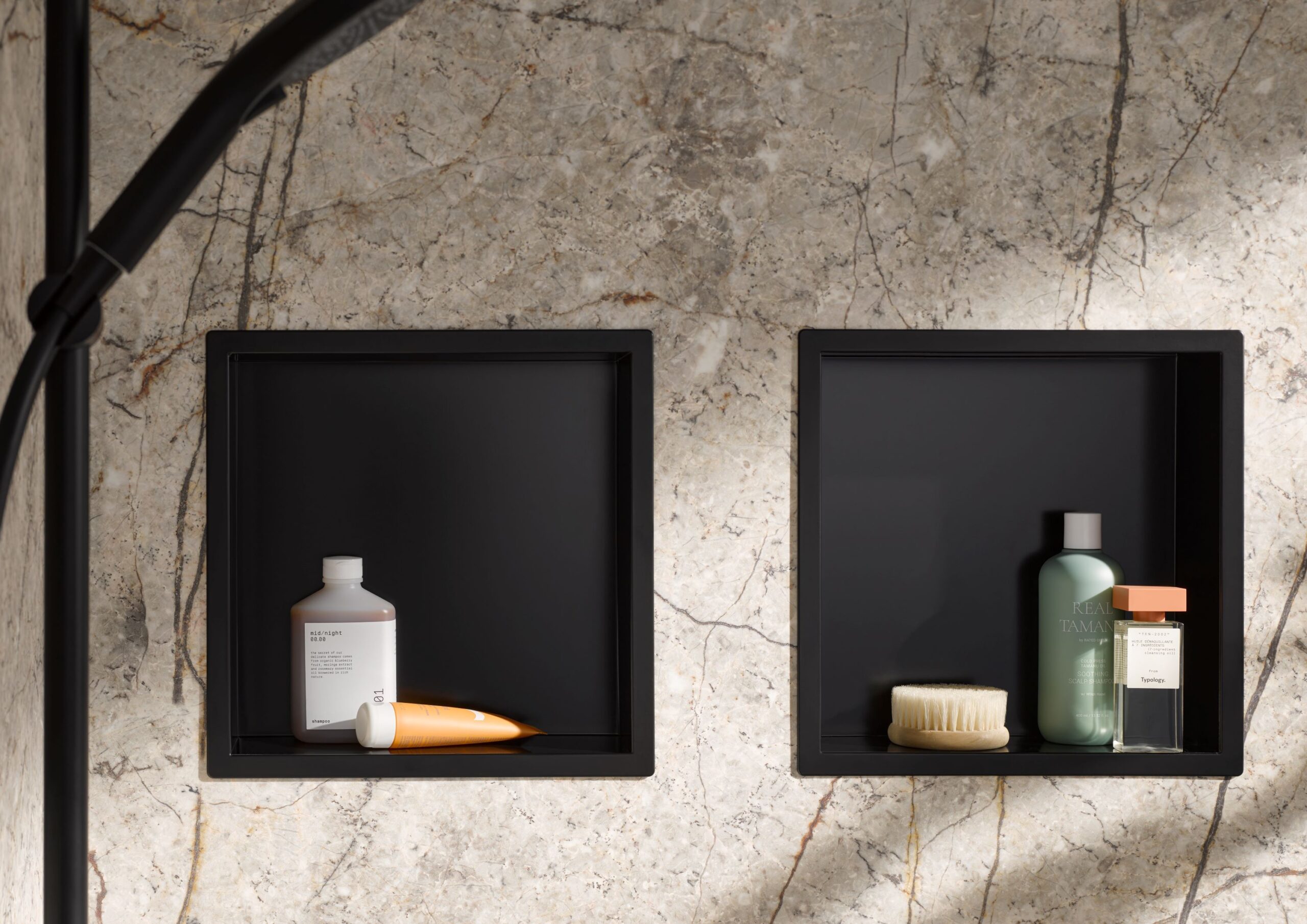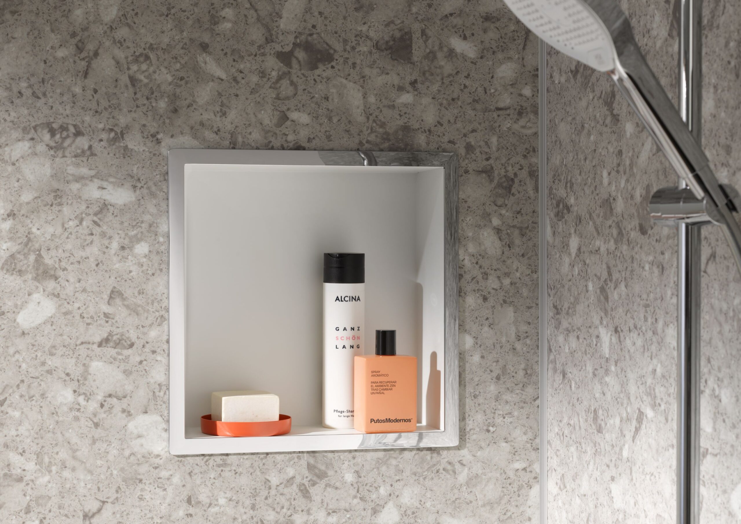 Für noch mehr Abstellmöglichkeiten können auch mehrere Boxen in den Duschbereich integriert werden. Die Kombination aus z. B. zwei RenoDeco Wandeinbauboxen ist nicht nur praktisch, sondern lockert die Duschkabine auch optisch auf.