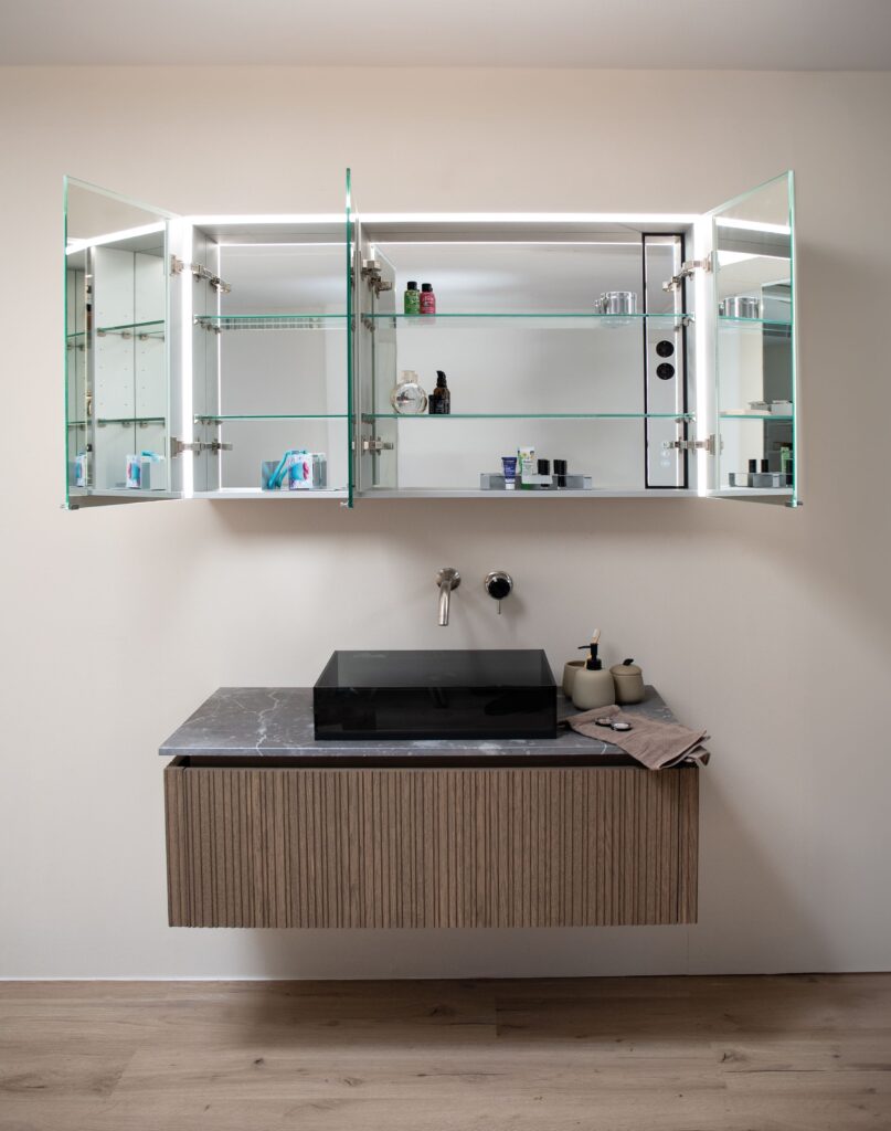 - Spiegelschrank-Konzept mit integrierter dreiseitiger LED-Beleuchtung