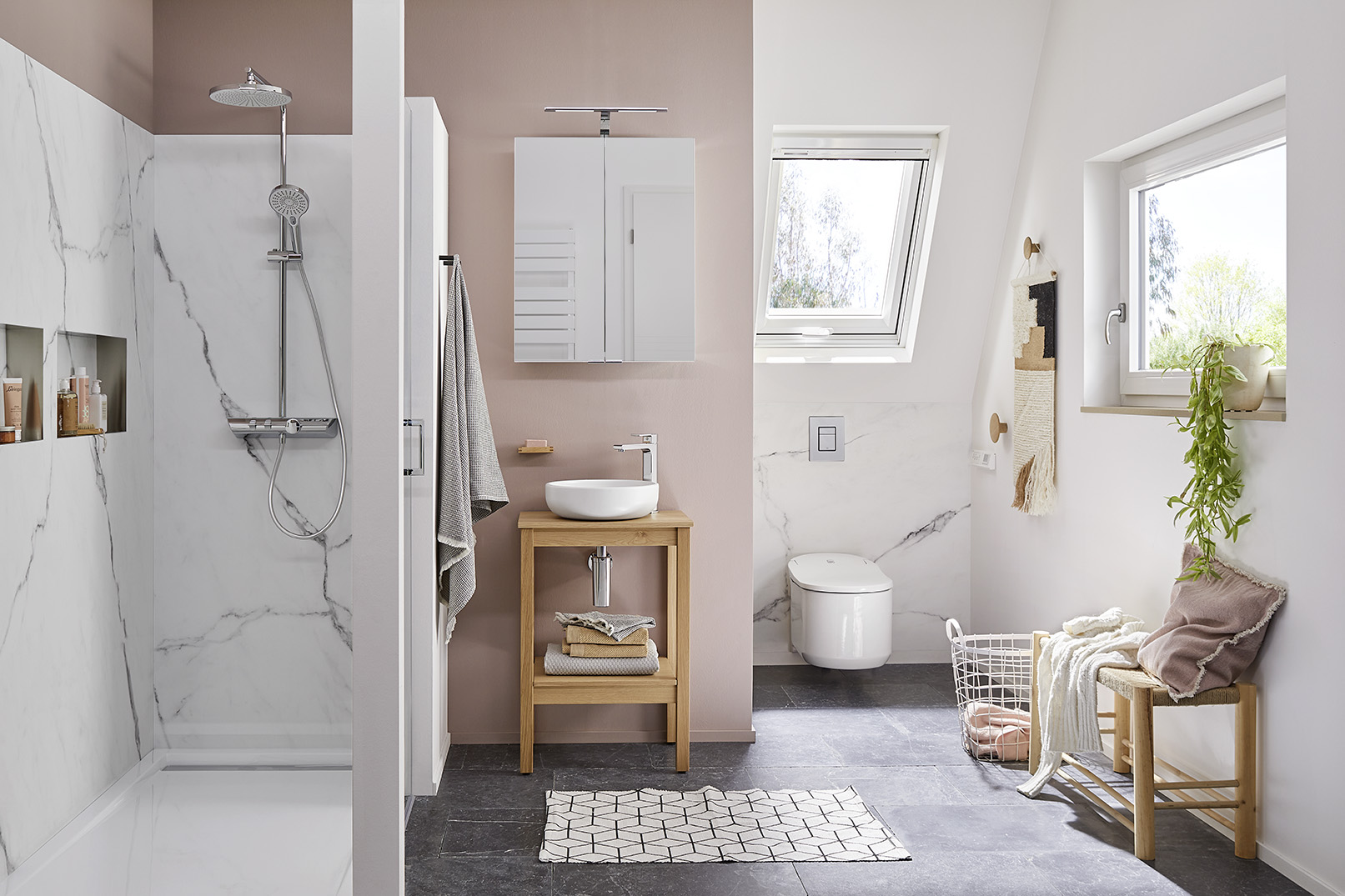 Die RenoDeco Platten Seidenmatt, Marmor, Carrara-Weiß kreieren in Kombination mit gedeckten Rosé-Tönen und stilvollen Holzakzenten einen edlen und gemütlichen Look – und das ohne eine einzige Fliese an der Wand.