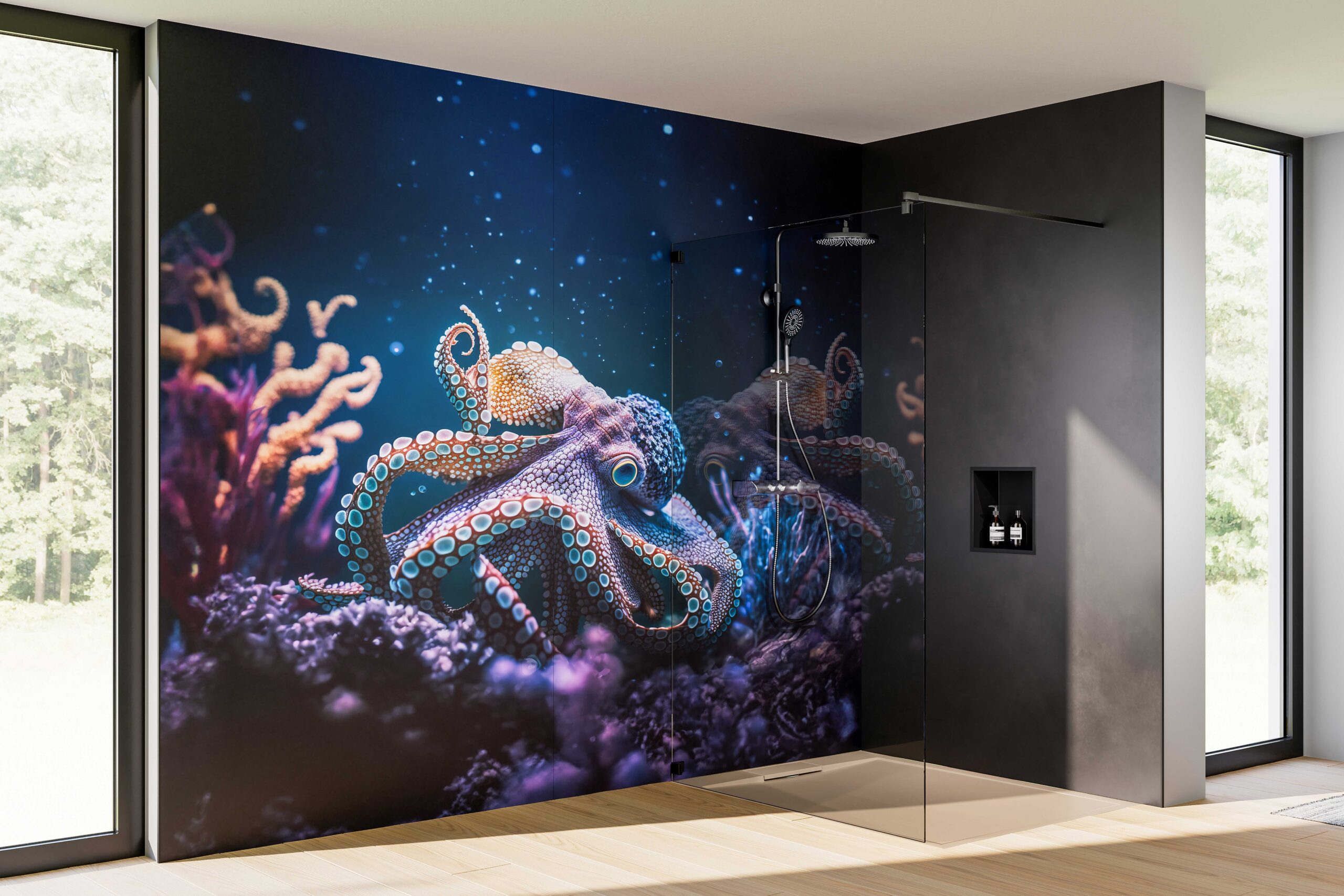 Eindrucksvolles Farbenspiel: Großflächige RenoDeco Motive wie der „Oktopus“ strahlen dank Sechsfarbdruck mit besonders ausdrucksstarken Farben.