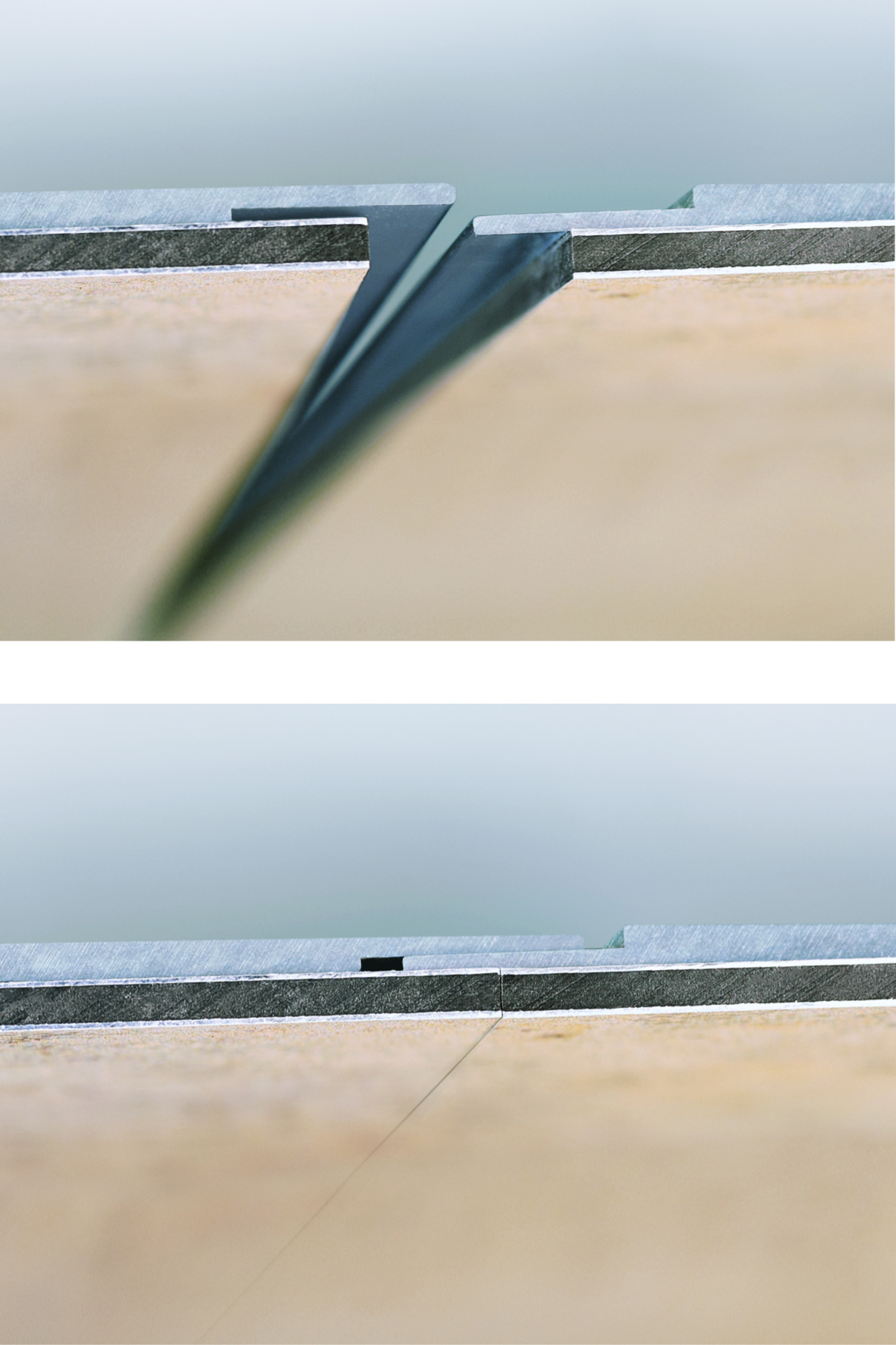 Die Bearbeitung von RenoDeco Wandverkleidungen funktioniert mit handelsüblichen Werkzeugen, die für eine Plattenbearbeitung geeignet sind. Für Längsschnitte verwendet man eine Handkreissäge mit einer Führungsschiene, für Ausschnitte auch eine Stichsäge und für Bohrungen eine Lochsäge oder auch einen normalen Spiralbohrer. Mit den Profilen können verschiedene Einbausituationen realisiert werden. Zum Beispiel Außenecken mit flächenbündigen Profilen, die selbstklebend auf die Plattenkante aufgesetzt werden. Außerdem kann die Platte mittels einer Fräskanttechnik geknickt werden, z. B. bei einem Vorwandsockel. Damit gestaltet der Profi einen profillosen Übergang wie aus einem Guss.