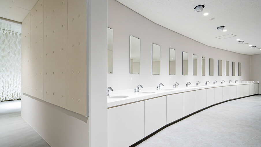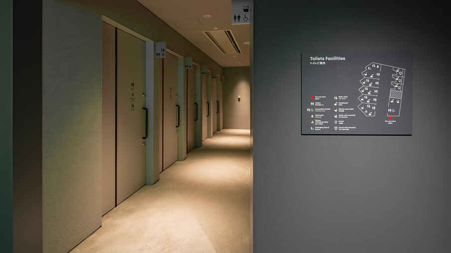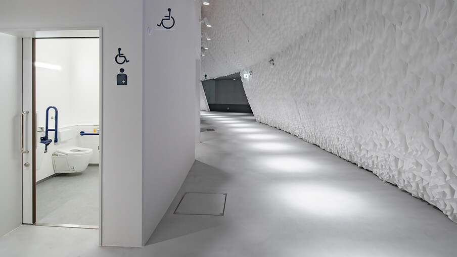 In die Ausstellung integriert sind auch die barrierefreien Sanitärräume, deren Ausstattung von TOTO als offiziellem Partner des Pavillons bereitgestellt und konzeptioniert wurden. TOTO hat bei der Entwicklung dieser Sanitärräume mit 22 „Problemsuchern“ zusammengearbeitet, 22 Personen mit ganz unterschiedlichen Einschränkungen, die mit Ihren Erfahrungen bei der Nutzung von öffentlichen Toiletten als Berater fungiert und zur optimalen Gestaltung beigetragen haben.