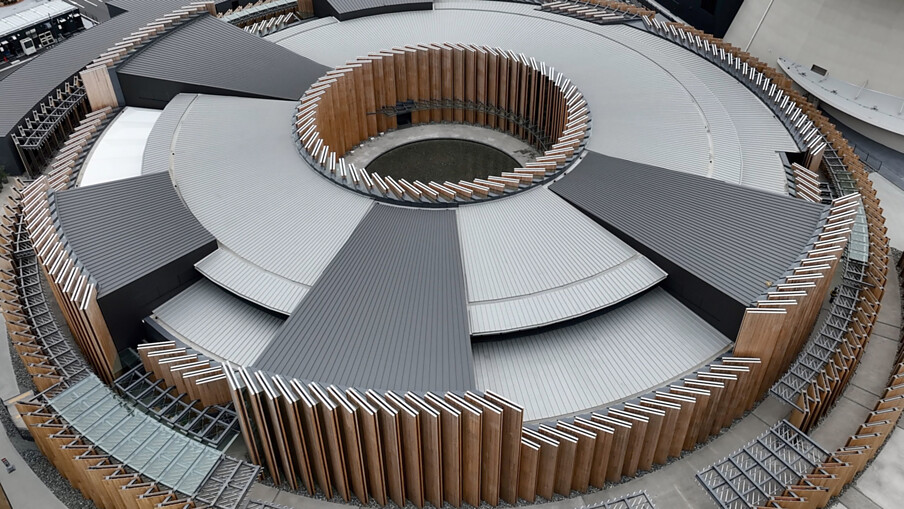 Der Kreis als Formensprache ist auch prägend für den Japanischen Pavillon, entworfen vom renommierten japanischen Architekturbüro Nikken Sekkei. Das markante, kreisförmige Bauwerk besteht aus zahlreichen Brettsperrholzlamellen, die in traditioneller japanischer Verbindungstechnik zusammengefügt sind. Er symbolisiert den Lebenszyklus sowie Japans kulturelle und ökologische Werte. Als „lebendes Gebäude“ nutzt er Expo-Abfälle über eine eigene Biogasanlage Energie zur Energiegewinnung und soll vollständig wiederverwendet werden – ein Zeichen für Kreislaufwirtschaft und Nachhaltigkeit.
