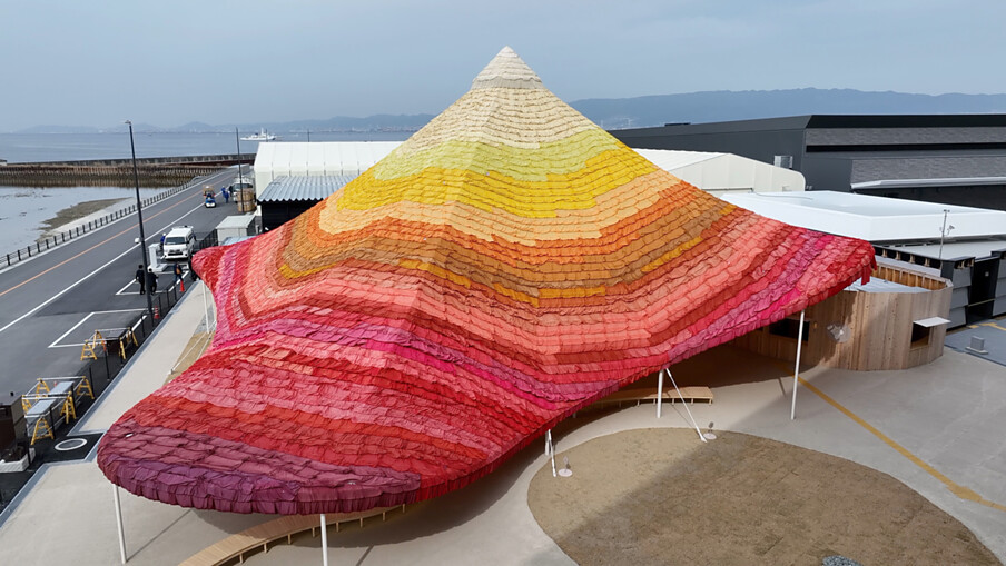 Die multifunktionale, mit Stoffbahnen überdachte Ruheanlage am Westtor der Expo mit Blick auf das Meer ist einer von vier Erholungsbereichen, der mit TOTO WCs und WASHLETs ausgestattet ist.